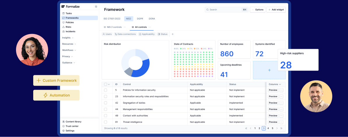 Formalize transforme les exigences de conformité accablantes en workflows de conformité exploitables. Fini le chaos, place à la clarté. Nous vous aidons à maîtriser DORA, NIS2 et tout ce qui viendra ensuite.